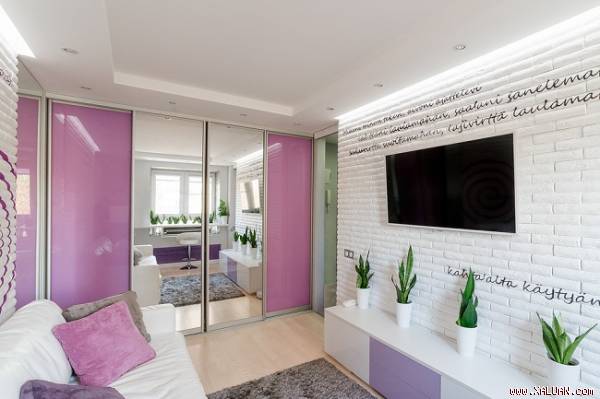 Bộ sofa trắng được đặt sát tường, điểm tô bằng những chiếc gối tựa màu tím nhạt cùng tông với cánh cửa tủ bên cạnh giúp sự kết nối màu sắc trong không gian được liền mạch và "ăn ý" với nhau. Bên cạnh đó, nét độc đáo từ họa tiết xoắn ốc màu tím trên tường cùng dòng chữ trên gạch khá ăn nhập với màu sắc nhấn tạo nên vẻ đẹp xinh tươi, nghệ thuật cho không gian.