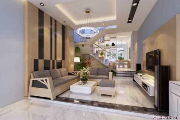 Phòng khách phong cách hiện đại với mảng nhấn bằng gỗ phíalưng sofa mang đến vẻ bề thế cho gia chủ khi ngồi tiếp khách ở đây. Trần thạch cao 2 lớp kết hợp đèn trần tinh tế. Tiểu cảnh vườn khô ở chân cầu thang mang đến cảm giác gần gũi với thiên nhiên.